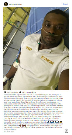 Na noite desta última segunda-feira (1/01), Jorge Sacramento, empresário de bandas como La Furia, Hiago Danadinho e Kannário, e dono da “Sacra Produções”, sofreu uma parada cardiorrespiratória. Segundo postagem em sua conta no instagram, Sacramento contou que começou a sentir falta de ar, e foi levado para o Hospital São Rafael. Apesar do susto, o empresário foi atendido pela equipe médica de saúde do local e passa bem. “Foi um susto proveniente da minha jornada de trabalho e tantas noites perdidas nessa minha trajetória que vcs me acompanham nas redes sociais”, declarou ele. Jorge ainda disse que, após o ocorrido, pretende rever suas prioridades, e conciliar seu trabalho com família. O filho do empresário, o cantor Hiago Danadinho, passou a noite com o pai no Hospital, e por esse motivo, não pôde comparecer ao Programa Universo, da TV Aratu, nesta terça-feira (2/01). Fonte: Aratu Online