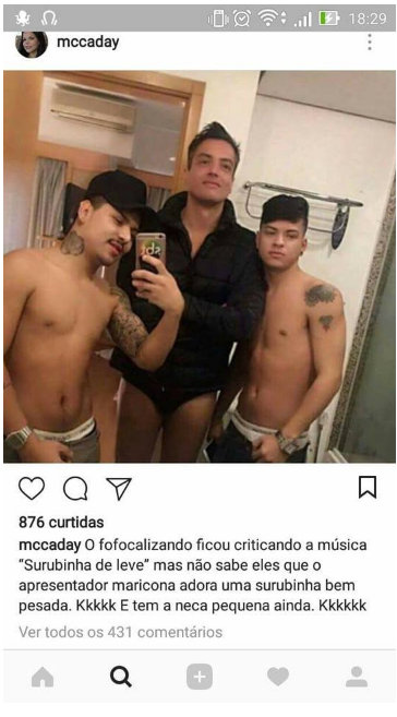 Day MacCarthy, a socialite acusada de racismo por atacar a filha de Bruno Gagliasso e Giovanna Ewbank, escolheu sua nova vítima brasileira: o colunista Leo Dias. Em seu Instagram, ela publicou uma imagem na qual o jornalista aparece ao lado de dois rapazes. Todos estão de cueca.“O Fofocalizando criticando a música ‘Surubinha de leve’, mas não sabem eles que o apresentador maricona adora uma surubinha bem pesada. Kkkkk e tem a neca bem pequena ainda. Kkkkkk”, escreveu ela. O rompante parece ter sido uma vingança. Day acredita ter sido chamada de prostituta por Dias. Em outra publicação, a socialite também insinua que Leo, além de pedófilo, oferece drogas a menores de idade. A imagem foi apagada da rede social, porém um print da conversa ainda está circulando na web. Na imagem, um dos supostos garotos-de-programa que aparecem na imagem cobra R$ 10 mil para mostrar a foto na cama com Leo Dias. O acerto seria ele receber 50% antes e os outros 50% depois de enviar todo o conteúdo. Com o nome de Pedro Gonçalves, o jovem aceita o trato. Porém, a foto ainda não divulgada.Fonte : Bocão News