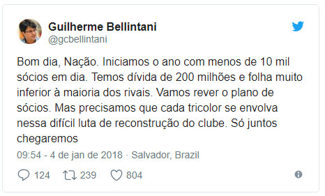 O presidente do Bahia, Guilherme Bellintani, utilizou o Twitter nesta quinta-feira (4) para interagir com os torcedores. Em uma mensagem, o mandatário tricolor indicou que no momento existem menos de 10 mil sócios em dia com o clube e citou a atual dívida do Esquadrão de Aço. "Bom dia, Nação. Iniciamos o ano com menos de 10 mil sócios em dia. Temos dívida de 200 milhões e folha muito inferior à maioria dos rivais. Vamos rever o plano de sócios. Mas precisamos que cada tricolor se envolva nessa difícil luta de reconstrução do clube. Só juntos chegaremos", publicou. Antes de assumir o clube, Bellintani indicou que fará ações para facilitar ainda mais o processo de associação. Entre elas, está a criação de um aplicativo. Fonte: Bahia Noticias
