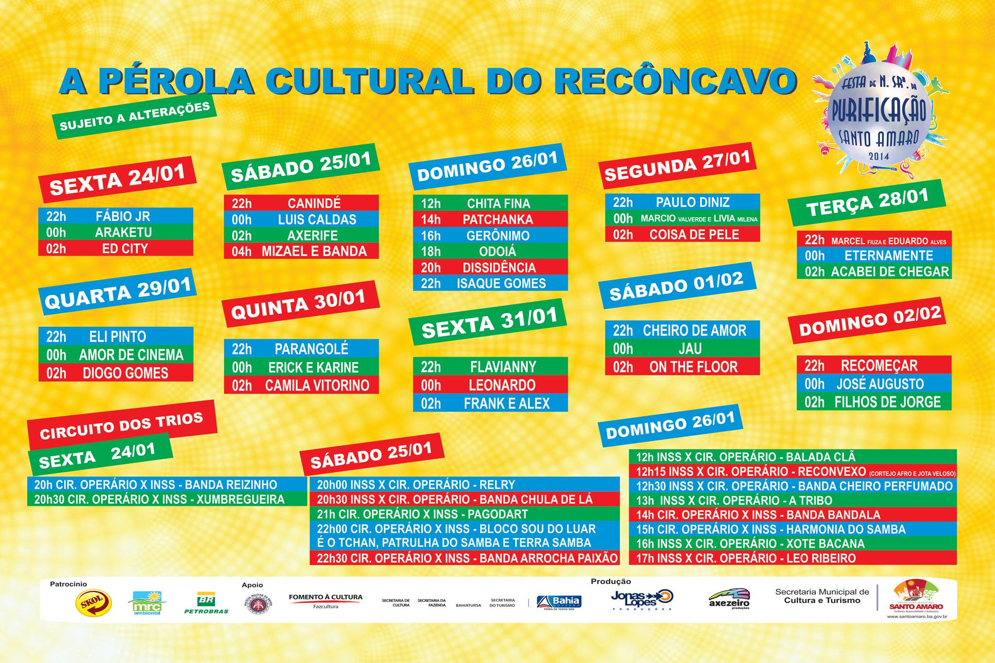 Festa da Purificação reúne cultura, fé e diversão em dez dias de festa. Grandes nomes da música nacional se apresentarão de 24 de janeiro a 02 de fevereiro na Festa de Nossa Senhora da Purificação, em Santo Amaro – Bahia. Considerada um dos mais tradicionais festejos da cidade por reunir milhares de pessoas todos os anos na Praça da Purificação, a festa vem em 2014 com o tema Pérola Cultural do Recôncavo, em homenagem aos artistas filhos da terra. Confira a programação da festa!