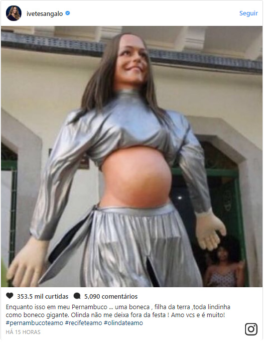 A cantora Ivete Sangalo ganhou um boneco de Olinda com a sua barriga de grávida. A representação da cantora é uma homenagem da organização do carnaval de rua de Pernambuco. Acostumada a marcar presença na festa em Recife e Olinda, este ano a baiana terá que ficar de fora dos festejos à espera do nascimento das filhas. Ela está em licença-maternidade desde o início de 2018. Agradecida pela homenagem, Veveta compartilhou a imagem do boneco no Instagram. "Enquanto isso em meu Pernambuco… uma boneca, filha da terra, toda lindinha como boneco gigante. Olinda não me deixa fora da festa! Amo vocês e é muito!", escreveu. Fonte: Metro1