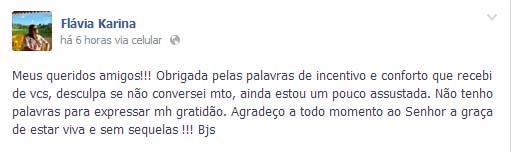 Flávia tranquiliza amigos pelo facebook, na manhã dessa segunda-feira