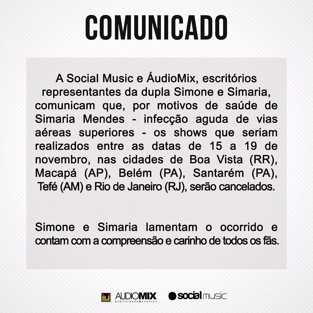 "A Social Music e ÁudioMix, escritórios representantes da dupla Simone e Simaria, comunicam que, por motivos de saúde de Simaria Mendes – infecção aguda de vias aéreas superiores – os shows que seriam realizados entre as datas de 15 a 19 de novembro, nas cidades de Boa Vista (RR), Macapá (AP), Belém (PA), Santarém (PA), Tefé (AM) e Rio de Janeiro (RJ), serão cancelados. Simone e Simaria lamentam o ocorrido e contam com a compreensão e carinho de todos os fãs", informou a nota.