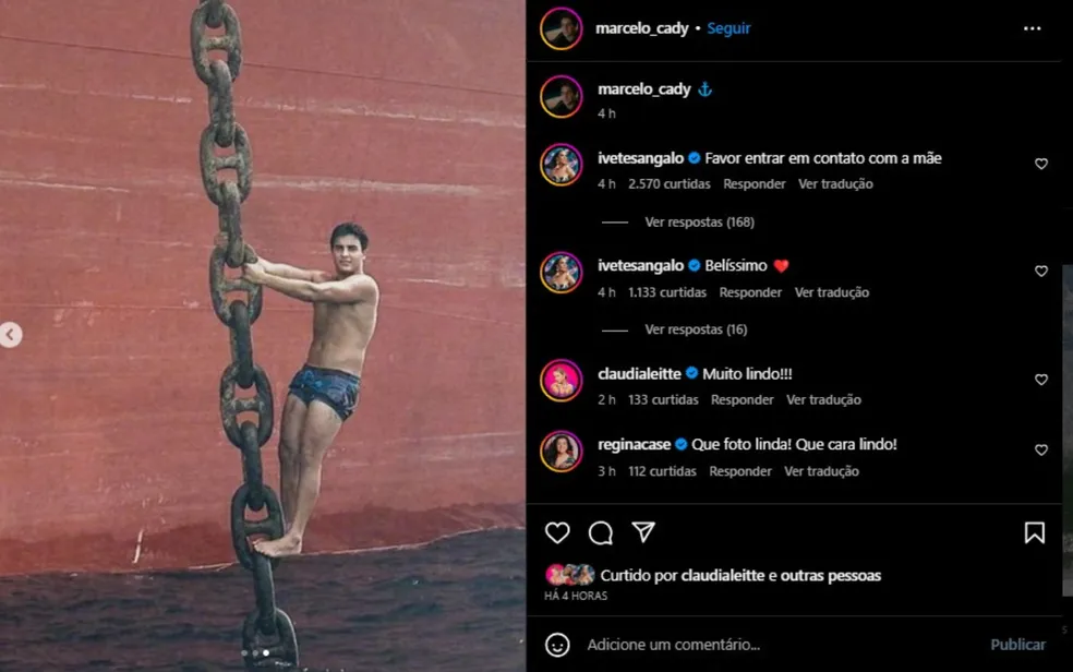 Marcelo Sangalo posta sequência de fotos pendurado em âncora e Ivete brinca: ‘favor entrar em contato com a mãe’