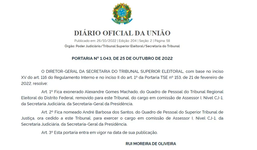 “Fica exonerado Alexandre Gomes Machado, do Quadro de Pessoal do Tribunal Regional Eleitoral do Distrito Federal, removido para este Tribunal, do cargo em comissão de Assessor I, Nível CJ-1, da Secretaria Judiciária, da Secretaria-Geral da Presidência”, diz trecho da publicação no Diário Oficial da União.