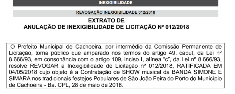 Após a divulgação dos valores que seriam pagos a Banda As Coleguinhas, com Simone e Simaria , no último dia 13 de maio, o prefeito da Cachoeira, no Recôncavo Baiano, Tato Pereira, decidiu cancelar o contrato com a dupla para tocar no São João Feira do Porto 2018.O cancelamento do Contrato pode ser conferido na publicação do Diário Oficial do Município desta terça-feira (29/05) no Extrato de Anulação de Inexigibilidade de Licitação de N° 012/2018.Tato iria pagar a dupla das Coleguinhas o valor de R$ 350 mil para um show de aproximadamente 2 horas. Diante do valor, a opinião pública criticou muito, achando o gasto exorbitante e tendo em vista que falta serviços essenciais para a comunidade, talvez por isso, o prefeito tenha mudado de ideia.Conforme informações, a atração será substituída pela banda Cavaleiros do Forró, porém, até o momento não foi divulgado o valor que será pago. Fonte: Diário da Noticia